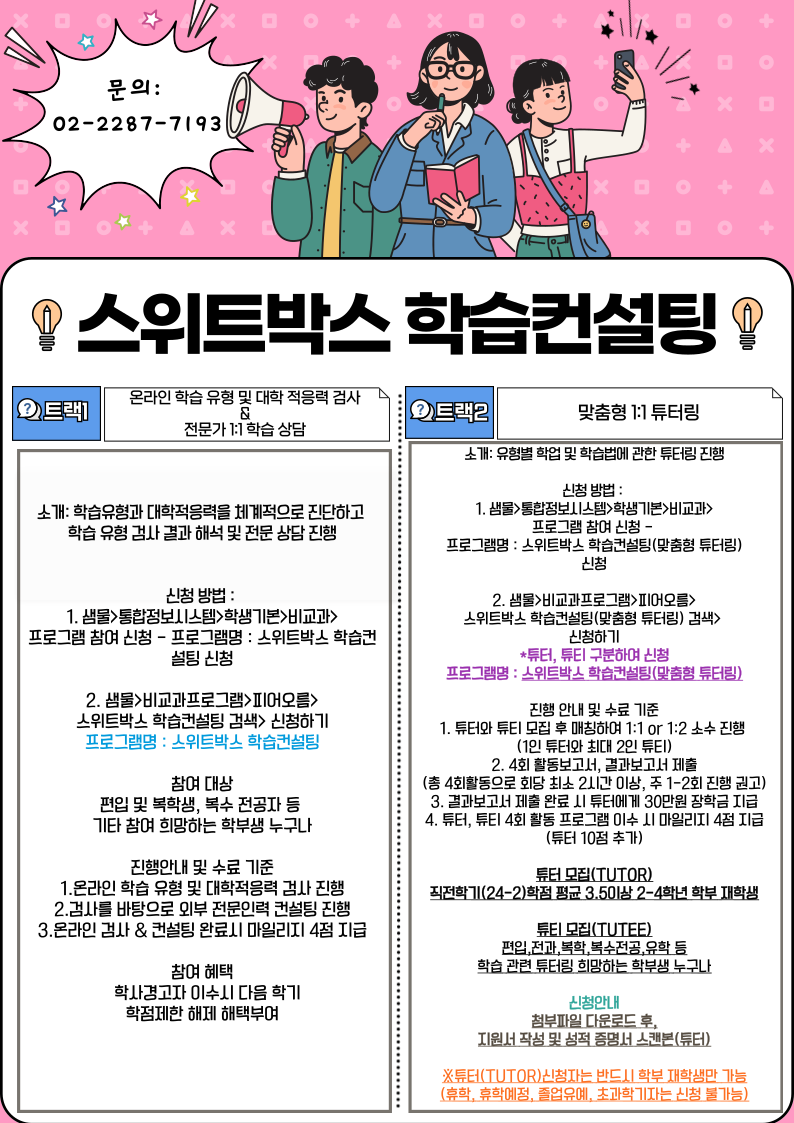 학업에 어려움을 겪고 있는 학생 등을 대상으로 학습 진단 및 컨설팅을 통해 맞춤형 학습전략을 제시해줌으로써 학업에 대한 중도포기와 이탈을 예방하는 프로그램