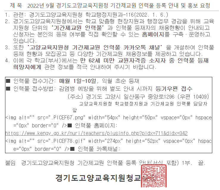- [기타] 2022년 10월 경기도고양교육지원청 기간제교원 인력풀 등록 안내