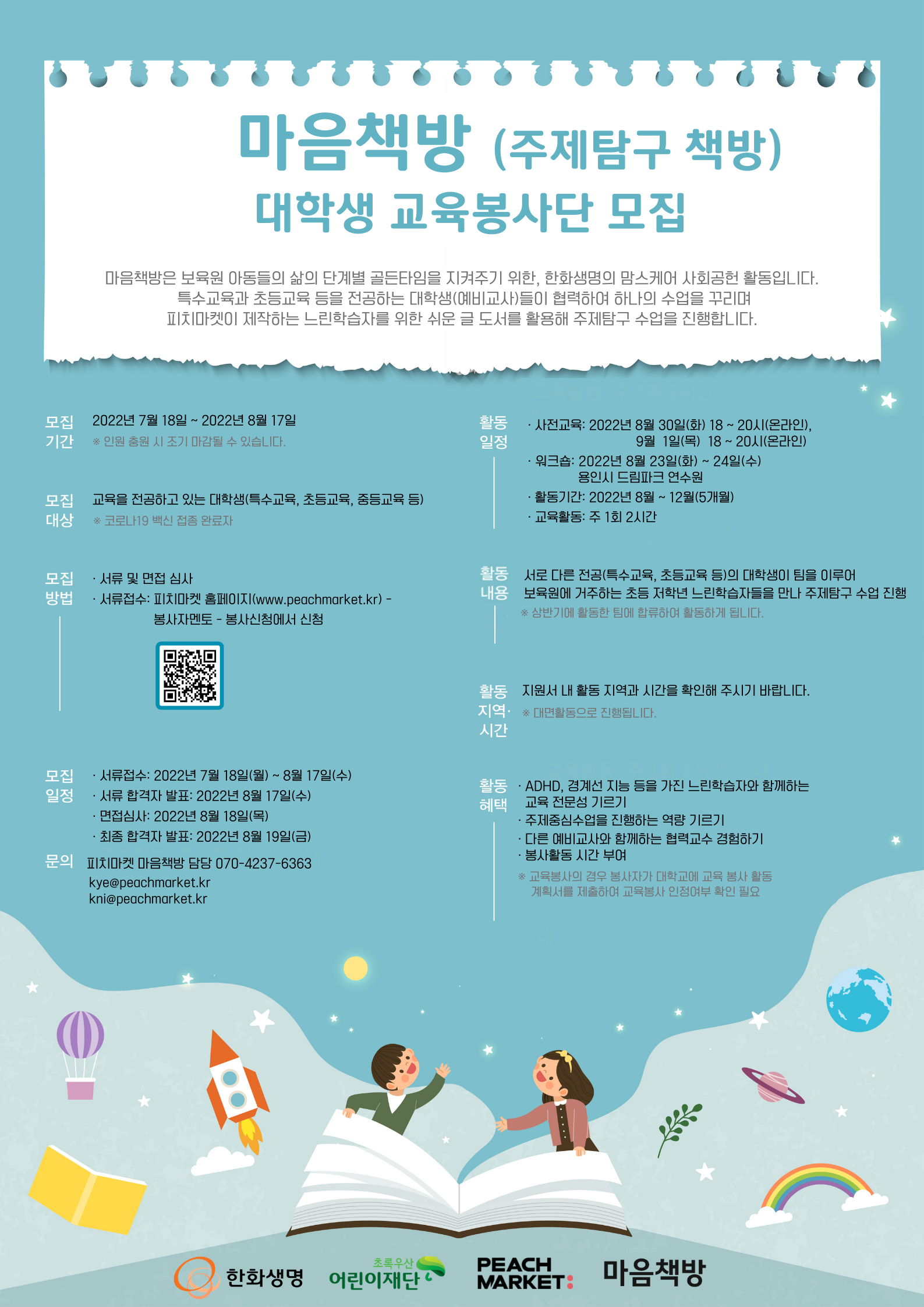 - [교육봉사] 피치마켓 마음책방 대학생 교육봉사자 모집 안내