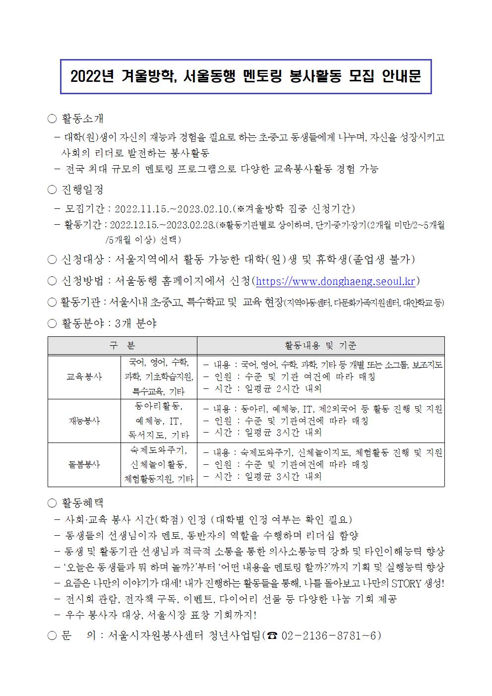 - [교육봉사] 2022년 겨울방학 중 서울동행 대학(원)생 멘토링 봉사활동 참여홍보