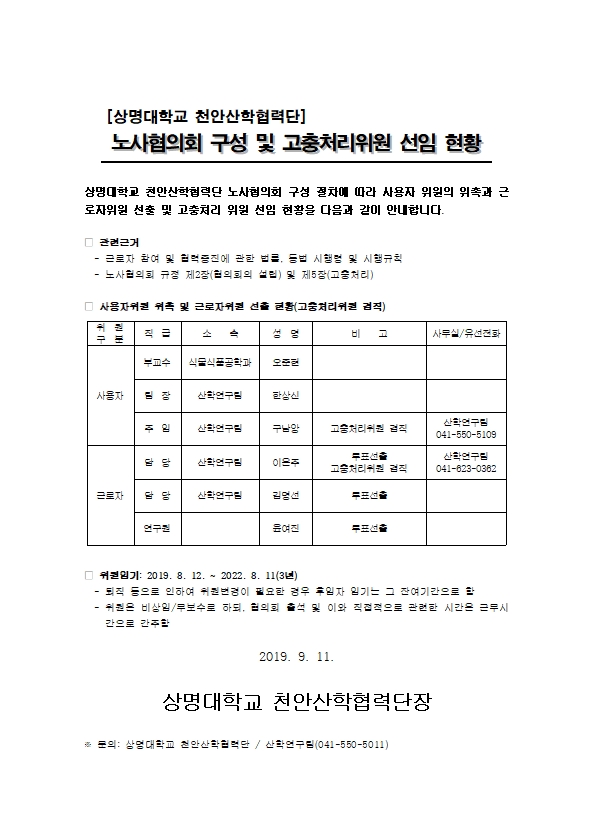 - [상명대학교 천안산학협력단]노사협의회 구성 및 고충처리위원 선임 현황 안내