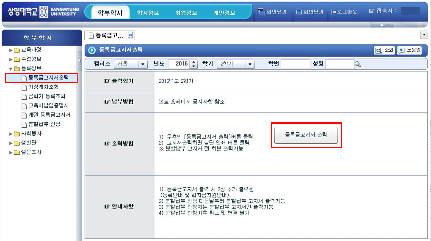 Q1. 등록금 고지서는 어떻게 출력하나요?