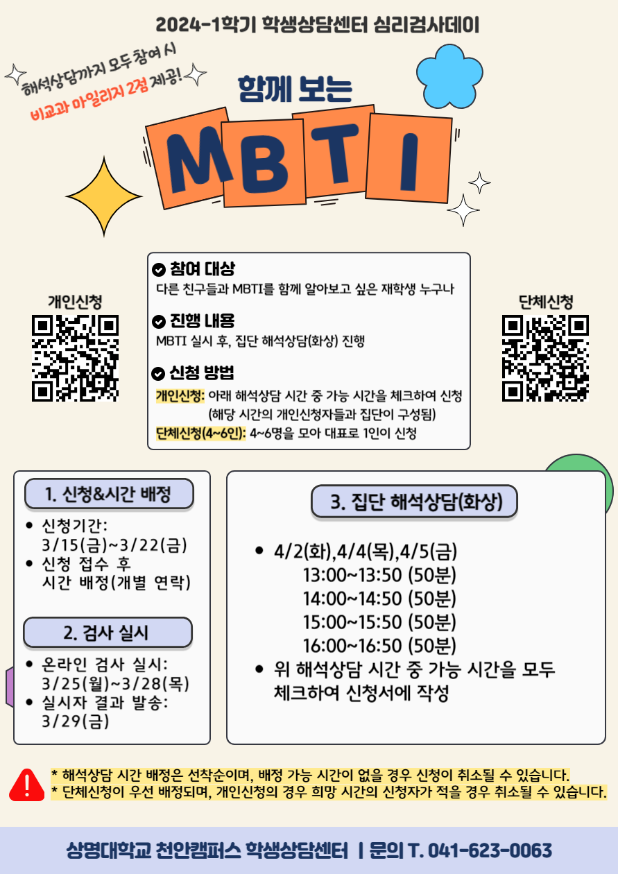 - [학생상담센터] 2024학년도 1학기 심리검사데이 '함께보는 MBTI' 신청 안내