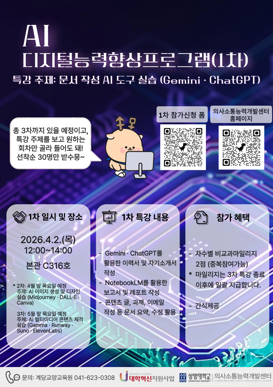 천안 [비교과] [의사소통능력개발센터(천안)] 2026-1 AI 디지털능력향상프로그램(1차) 참여자 모집