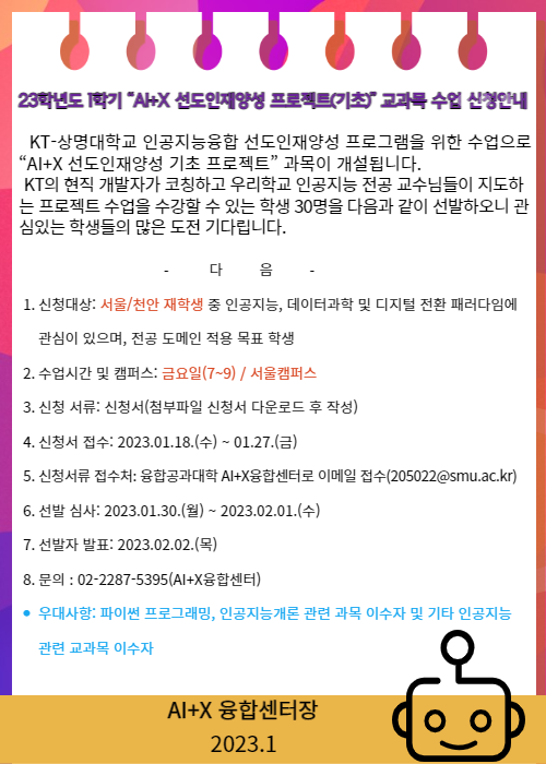 - [마감] '23학년도 1학기 “AI+X 선도인재양성 기초 프로젝트” 교과목 수업 신청