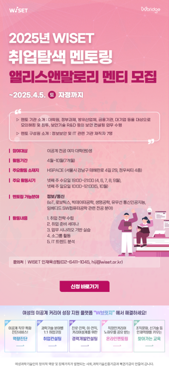 - 2025년 WISET 「취업탐색 멘토링」 참여 이공계 대학(원)생 멘티 모집