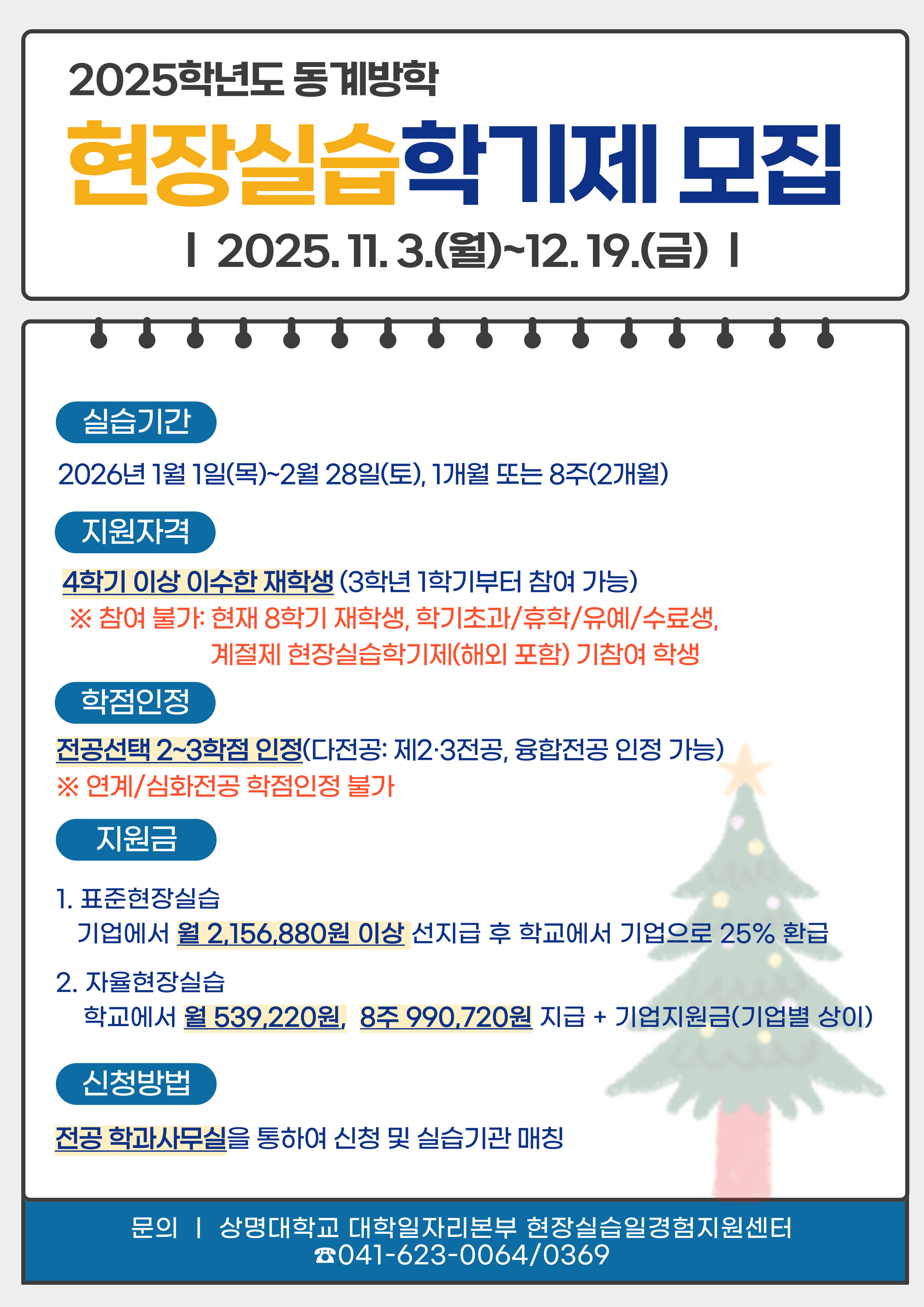 | 천안 [진로취업] | [현장실습·일경험지원팀] 2025학년도 동계방학 현장실습학기제 시행 공고 |