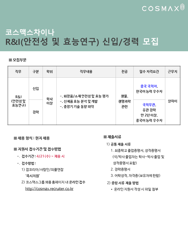 - [취업 및 진로] 코스맥스그룹 사원 모집 안내(중국인 유학생)